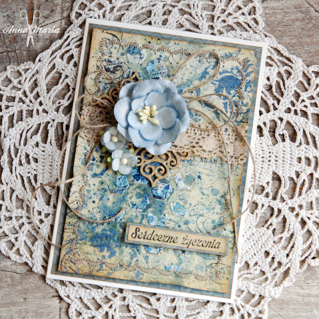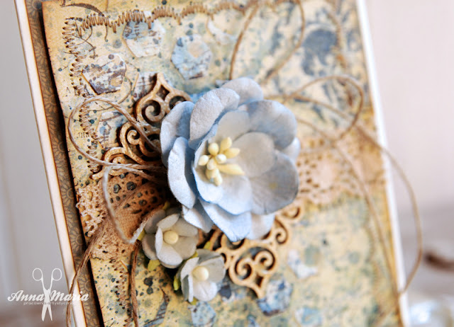 Dziś mam takie połączenie: błękit, bladożółty i szary. Podoba się Wam? Elementów w pracy nie ma zbyt wiele - trzy kwiatki, dwie tekturki, koronka i sznurek. Cały efekt robi pasta strukturalna i akwarele.