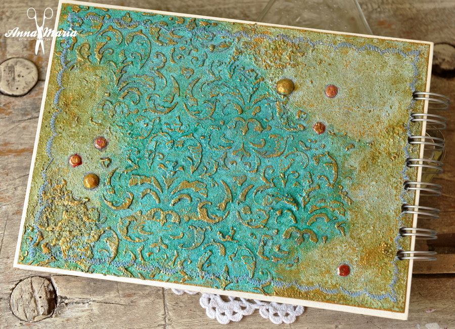 Na okoliczność naszego spotkania postanowiłam przygotować skromny upominek w postaci szkicownika. Uznałam, że najlepsza będzie dość płaska okładka w stonowanej kolorystyce. Skupiłam się na teksturach, które stworzyłam za pomocą past strukturalnych, a także dużej ilości guzików, koralików i innych drobiazgów. Całość pokolorowałam farbami Art Anthology oraz Inka Gold.