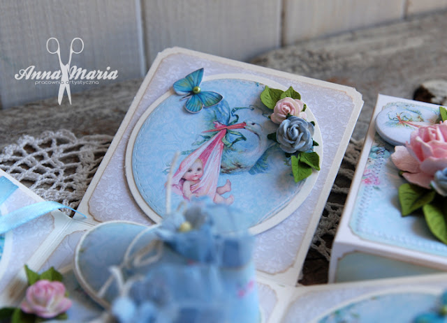 Na wewnętrznych ściankach umieściłam piękne grafiki wycięte z poszczególnych arkuszy. Są one tak urocze, że bogate zdobienie okazało się zbędne. Ograniczyłam je jedynie do kilku elementów z masy plastycznej oraz motylków. Oczywiście, moja praca nie mogłaby istnieć bez maleńkich różyczek.